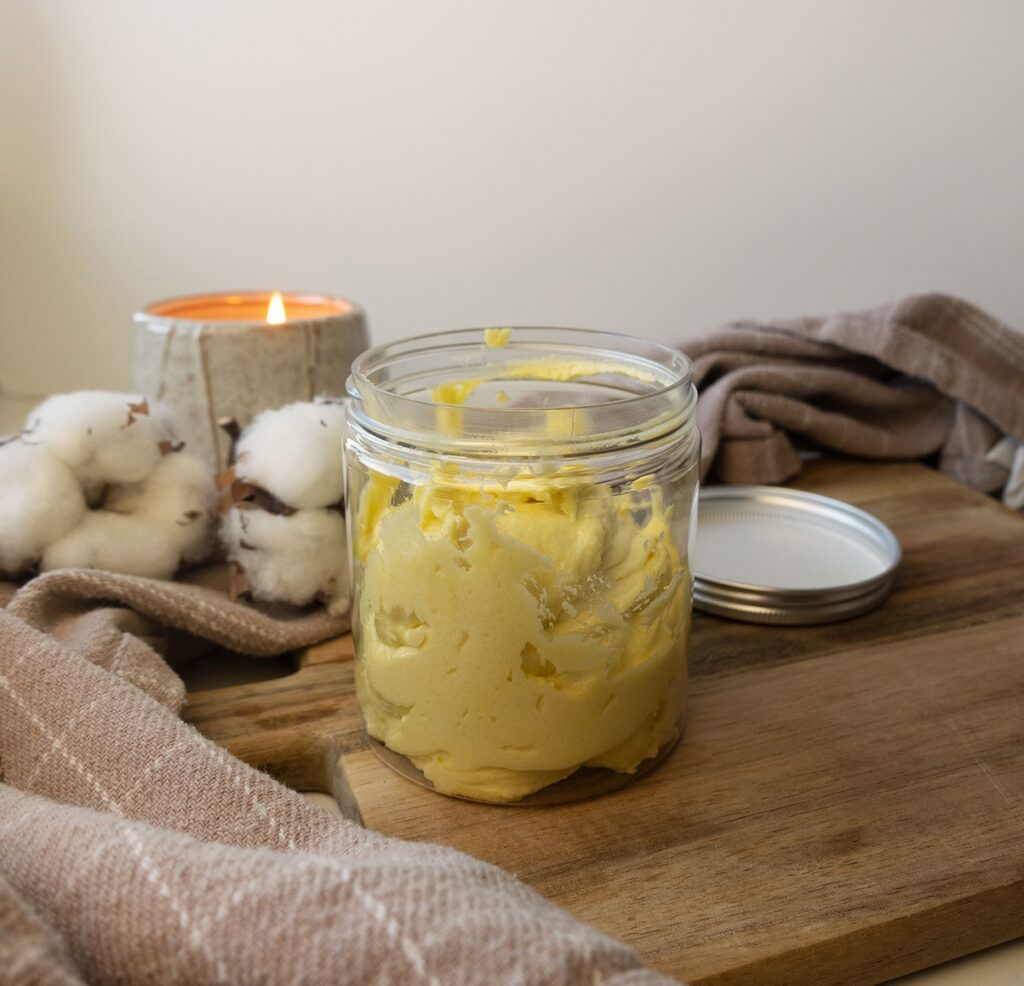 I denne opskrift benytter vi økologisk Sheasmør, da det er denne ingrediens der giver den fede konsistens, langsomt absorberende effekt og den cremede tekstur. Sheasmør er en perfekt fed ingrediens til tør hud og for at mindske rødme i huden, som ofte forekommer ved tørre områder.