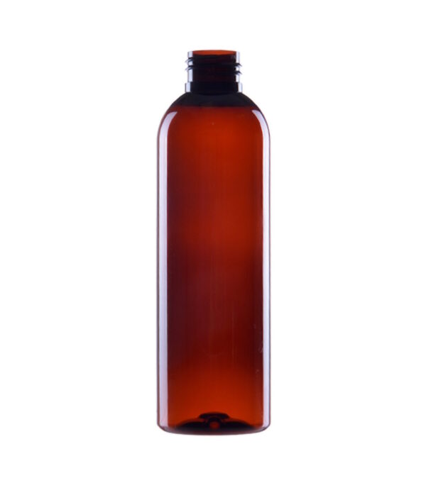 Brun gennemsigtig plastflaske i PET plast. Flasken kan rumme op til 200 ml.