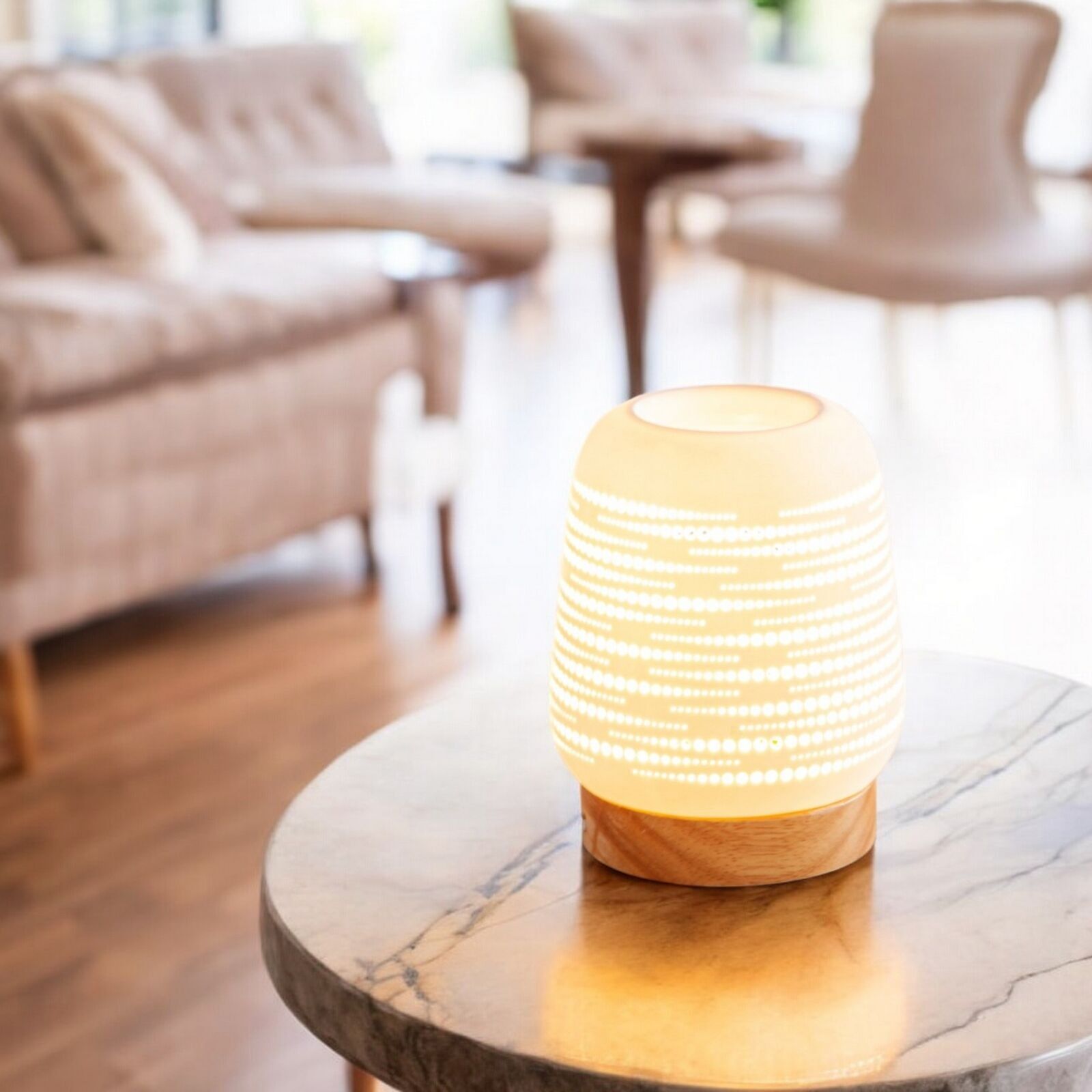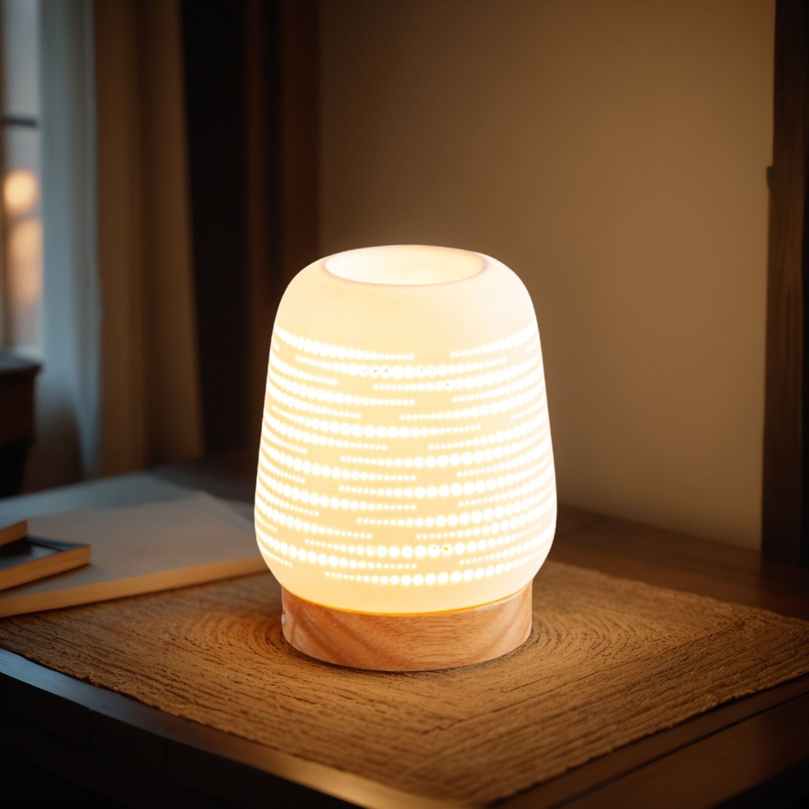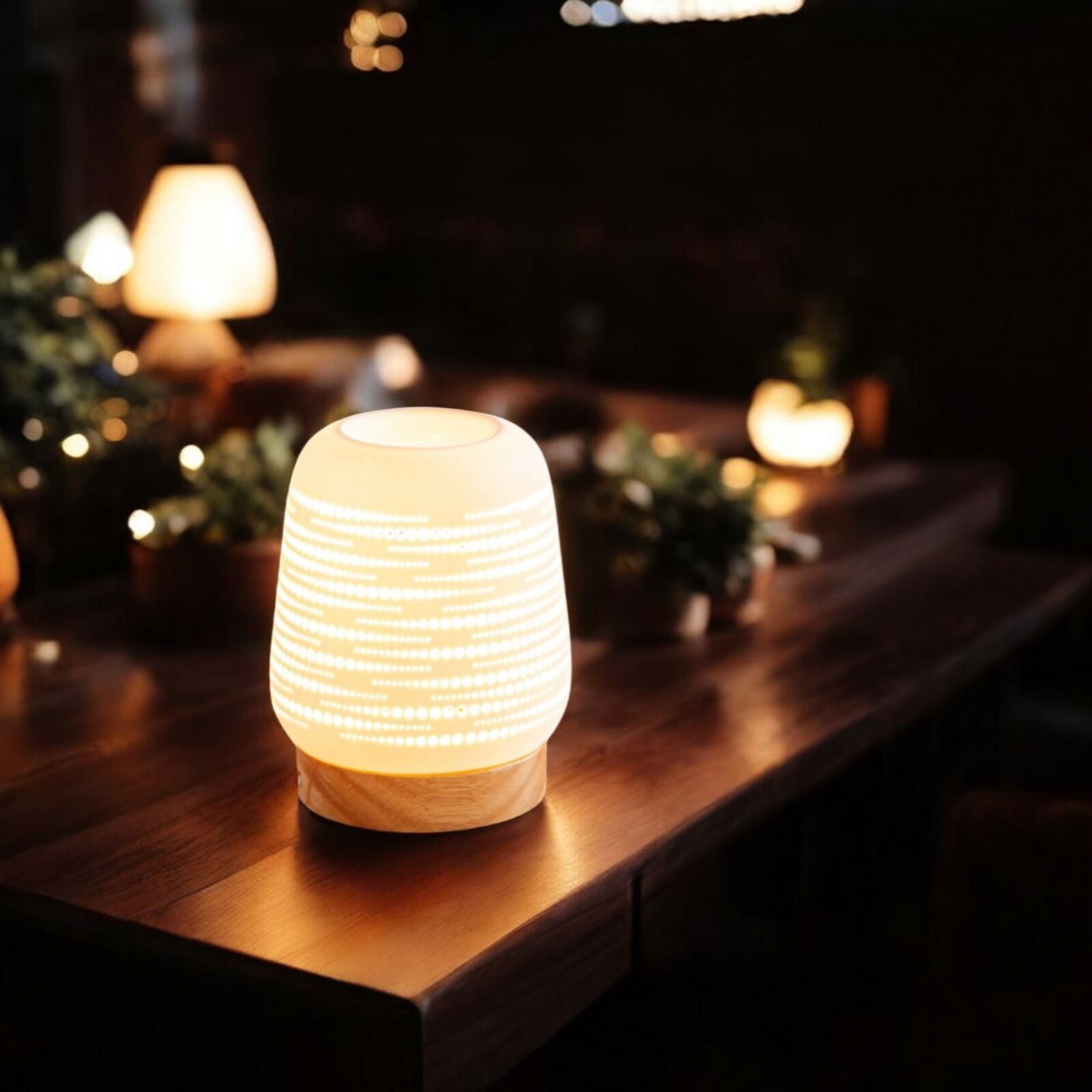 Denne stilfulde duftdiffuser kombinerer funktionalitet med æstetisk design. Fremstillet i kvalitets keramik og træ skaber den en varm og indbydende atmosfære i ethvert rum.