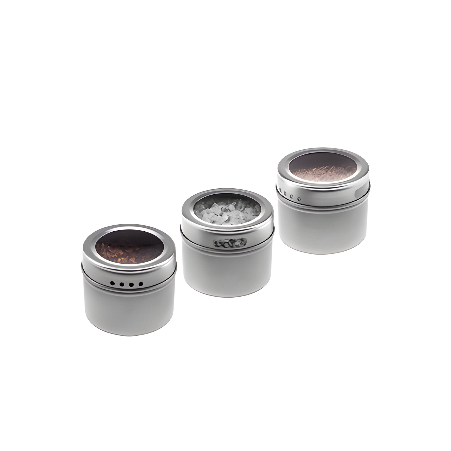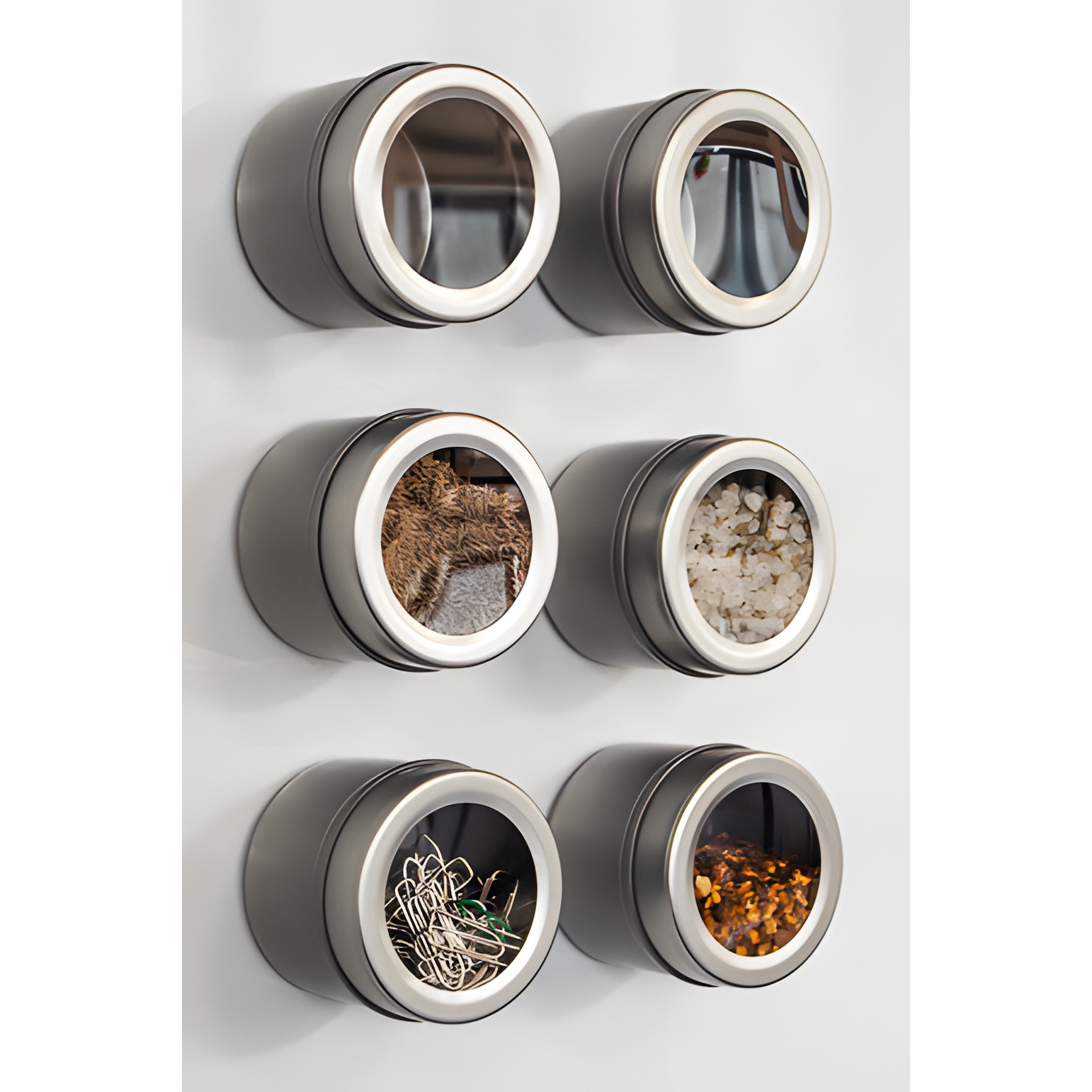 Metaldåse på 110 ml. med magnet i bunden. Dåsen har en praktisk, kompakt form og kan let fastgøres på magnetiske overflader som køleskabe eller metalstrips – perfekt til at holde styr på køkkenets småting.