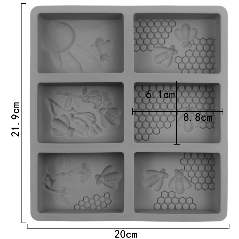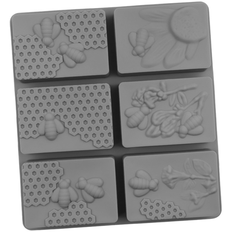 Sæbeform i silikone, Formen kan lave 6 stk. sæber i rektangel form ad gangen. Formen har 6 forskellige motiver der alle relaterer til bier.