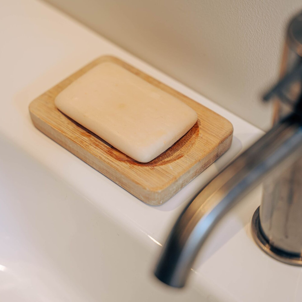 Sæbeholderen er lavet af 100% naturlig bambus og har drænhuller, så restsæbevand let kan løbe ud.